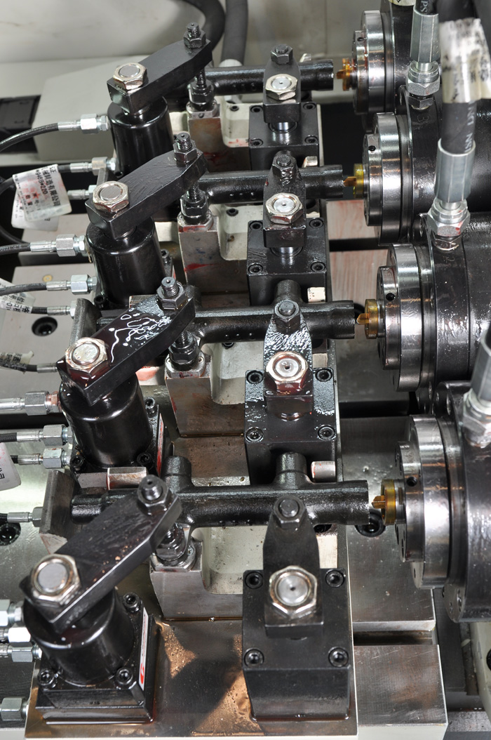 工件:為高壓油軌設計的專用工裝,液壓旋轉壓板夾緊工件;