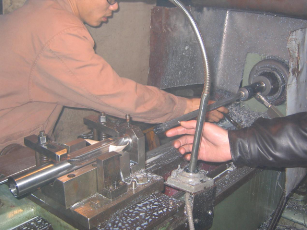 2、根據(jù)實(shí)際情況設(shè)計(jì)工裝,將工件固定在機(jī)床中托板上。并可以設(shè)計(jì)導(dǎo)向套安裝在工件前端面,引導(dǎo)深孔鉆進(jìn)入。此種方法不需在深孔加工前加工引導(dǎo)孔。大大提高了加工效率。改造深孔鉆鏜床刀具的安裝可根據(jù)工件的實(shí)際情況選擇方式:機(jī)床轉(zhuǎn)速和最小進(jìn)給量都能滿足加工要求時(shí),旋轉(zhuǎn)夾具錐柄直接安裝在機(jī)床主軸錐孔內(nèi),刀具安裝在旋轉(zhuǎn)夾具,機(jī)床主軸通過旋轉(zhuǎn)夾具帶動刀具作旋轉(zhuǎn)運(yùn)動,進(jìn)給運(yùn)動由大托板提供。