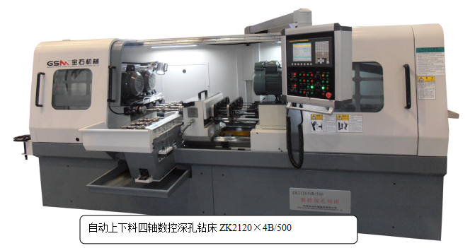 應(yīng)廣大用戶(hù)的要求,金石機(jī)械在之前制造四軸槍鉆機(jī)床的基礎(chǔ)上,針對(duì)工件裝卸的不便及費(fèi)時(shí)的缺點(diǎn),研發(fā)了如下自動(dòng)上下料的四軸深孔鉆床。大大提高了槍鉆機(jī)床的利用率,并降低了操作工人的勞動(dòng)強(qiáng)度。很快得到廣泛應(yīng)用。