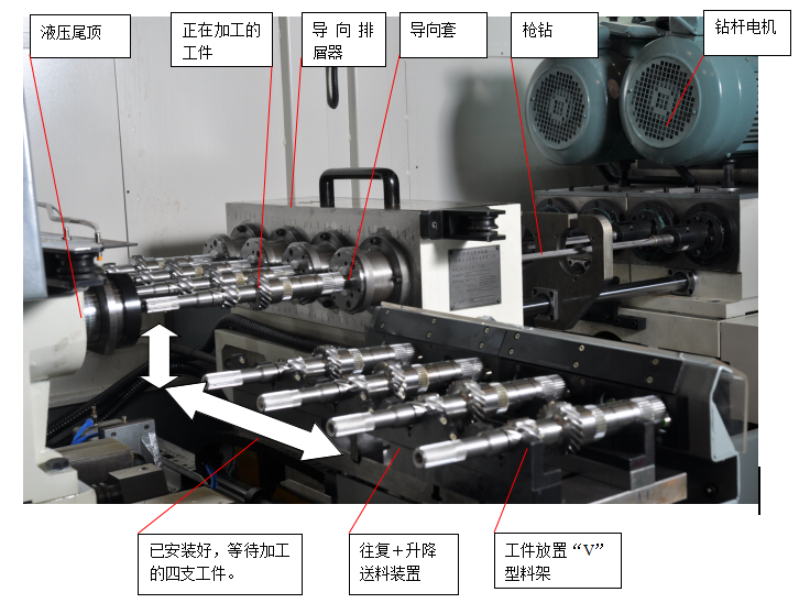 該機(jī)床的工件裝卸由人工實(shí)施。即人工安裝四支工件在預(yù)定位支架上,機(jī)床開(kāi)始深孔鉆削。加工完成后,機(jī)床停止加工,人工將加工好的四支工件取走,再重新安裝上四支新工件。往復(fù)運(yùn)行。