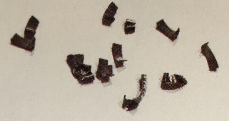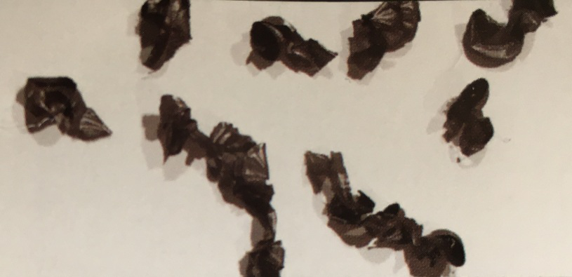 整體焊接式槍鉆加工鐵屑形狀見(jiàn)下圖,長(zhǎng)度均較長(zhǎng),容易堵屑、纏屑。