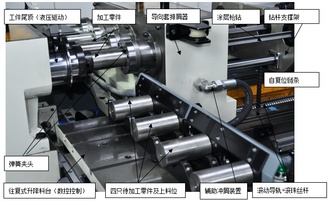 機(jī)床具備四主軸、八工位設(shè)計(jì),工件采用彈簧夾頭通過(guò)零件外圓自動(dòng)定位夾緊。機(jī)床配置伺服驅(qū)動(dòng)數(shù)控控制的自動(dòng)往復(fù)升降式上料臺(tái),其料臺(tái)的數(shù)控橫移、升降以及固定的上下料區(qū)域設(shè)計(jì),均可使機(jī)床以極好的適應(yīng)性匹配適宜的如桁架機(jī)械手或六軸機(jī)器人或功能氣缸等自動(dòng)化形式,槍鉆工序的整個(gè)加工過(guò)程則在數(shù)控方式下實(shí)現(xiàn)了完全的自動(dòng)化加工。
