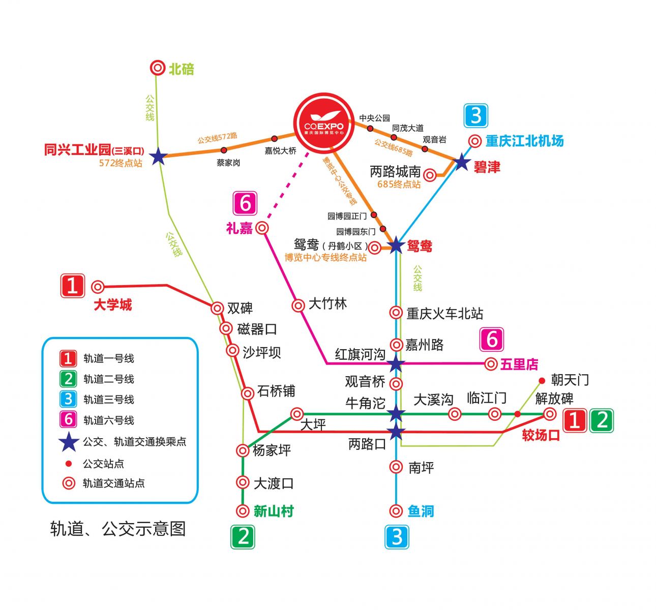 1. 乘坐博覽中心專(zhuān)線至【軌道鴛鴦?wù)尽繐Q乘軌道交通3號(hào)線至【兩路口】換乘軌道交通1號(hào)線至【沙坪壩】
